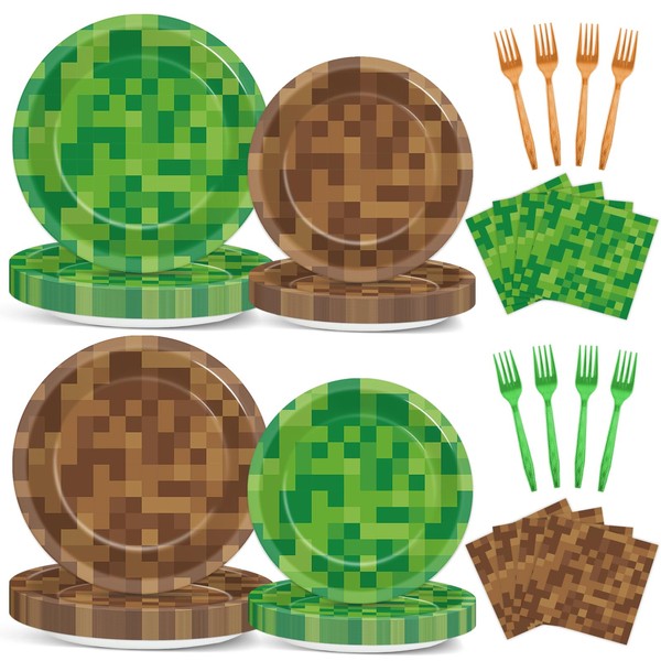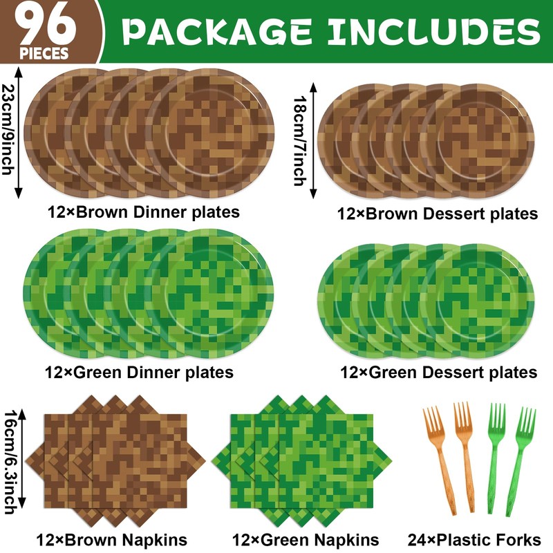 - Package Includes:The pixel style tableware includes 12 pieces of 9 inch brown plates and 12 pieces of 9 inch green plates, 12 pieces of 7 inch brown plates and 12 pieces of 7 inch green plates, 12 brown napkins and 12 green napkins, 12 brown forks and 12 green forks. Our mining pixel dinnerware, with sufficient size and quantity, can meet the needs of large gatherings