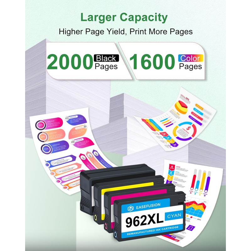 - Performance print: Enhance your printing experience and boost performance with EaseFusion 962XL Ink Cartridges. Featuring advanced chip technology, these cartridges are specifically designed for "H P+" printers, ensuring seamless compatibility and superior results