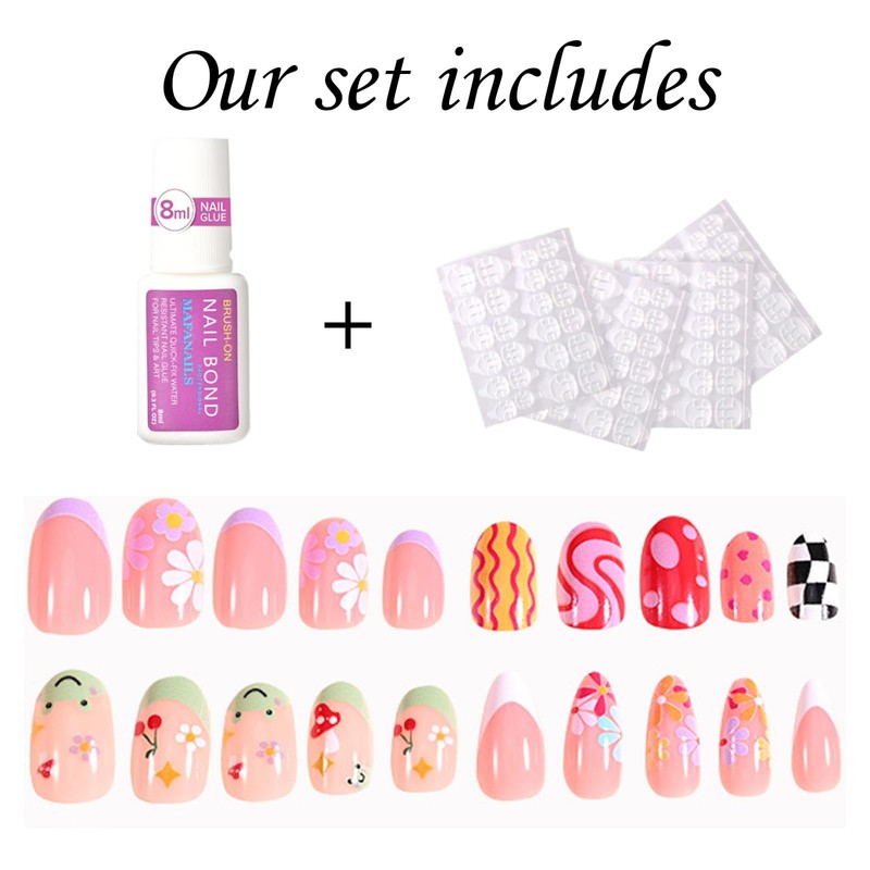 - 96-Piece Girls Fake Nails Set – Includes 4 themed designs (24 nails each) + 4 jelly glue and 1 strong glue. Perfect for kids & women, lightweight & comfortable