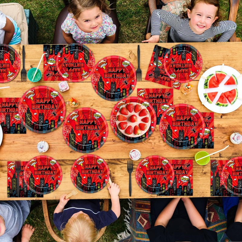 - Package includes: The super theme hero party tableware set includes 24pcs 9 inch spider fans party plates, 24pcs 7 inch dessert plates, 24pcs 6.5 inch spider party napkins, and 24pcs black forks. Each set can serve 24 guests.