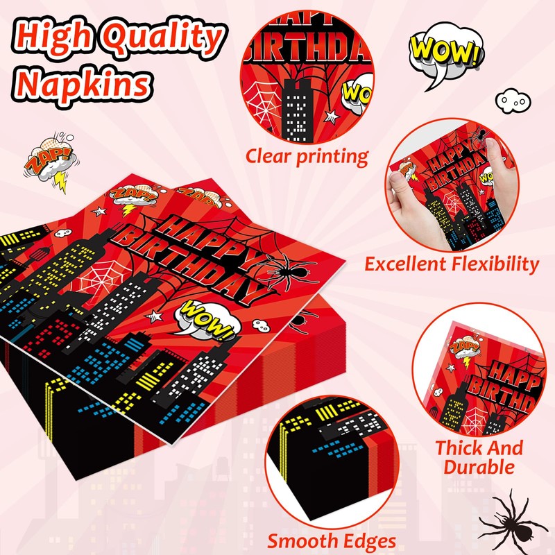 - Premium material: Crafted from thick, heat-resistant paper, these red spider birthday party plates are sturdy enough to hold a variety of foods. The party napkins are soft, absorbent, and the plastic forks are durable and break-resistant.