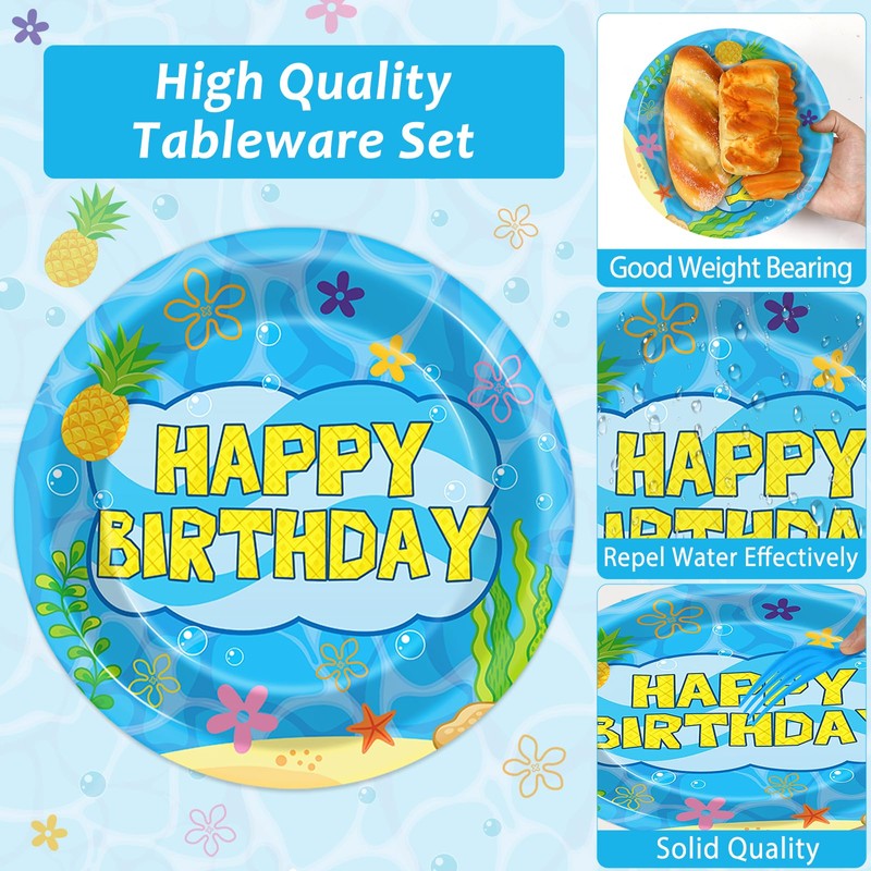 - Yellow cartoon theme design: Designed with a fun yellow cartoon theme, the summer ocean party tableware set feature a vibrant undersea scene with starfish, seaweed, pineapples, and "Happy Birthday" letters. The yellow cartoon party tableware set effortlessly captures guests’ attention, making it a standout addition to your birthday celebrations.