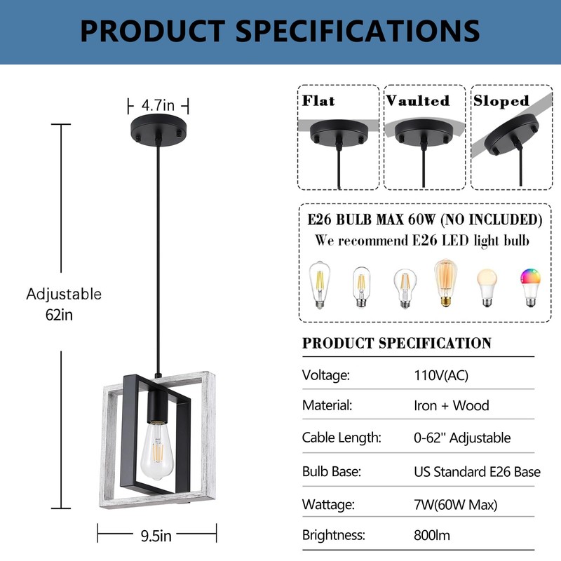 - ใ๐๐๐ซ๐ฌ๐๐ญ๐ข๐ฅ๐ ๐๐ข๐ ๐ก๐ญ๐ข๐ง๐ ๐ ๐ข๐ฑ๐ญ๐ฎ๐ซ๐๐ฌใWith dimensions of 62"L x 9.5"W x 9.5"H, industrial pendant light fixture is perfect for a variety of settings, include bedroom, living room, hallway, corridor, kitchen, dining room, and more. Adjustable height(62'' Max) feature makes small wood pendant light suitable for different ceiling heights, offering flexibility in installation.