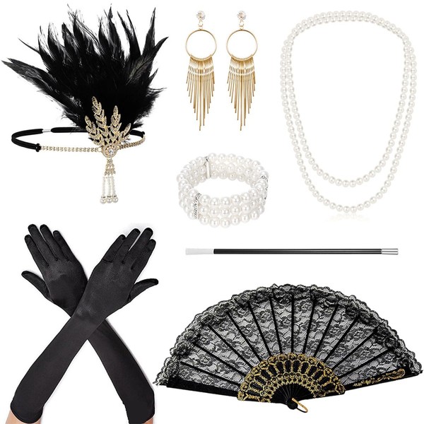 - Packing List: It comes with 9pcs 1920s Accessories Set, which includes 1pcs 1920s feather hairband, 1 pair long gloves(2pcs), 1 pair earrings(2pcs), 1pcs long holder, 1pcs faux pearl necklace, 1pcs pearl bracelet, 1pcs lesbine folding fan