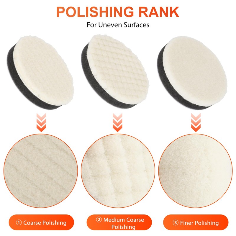 • 3 GRADE WOOL POLISHING PADS: Wool polishing pads are available in different variations for specific polishing needs. The lined surface is suitable for rough polishing, the gridded surface is ideal for medium polishing, and the non-lined surface is best for fine polishing. These different corrugated wool pads allow you to work deeper and meet various requirements during the polishing process.