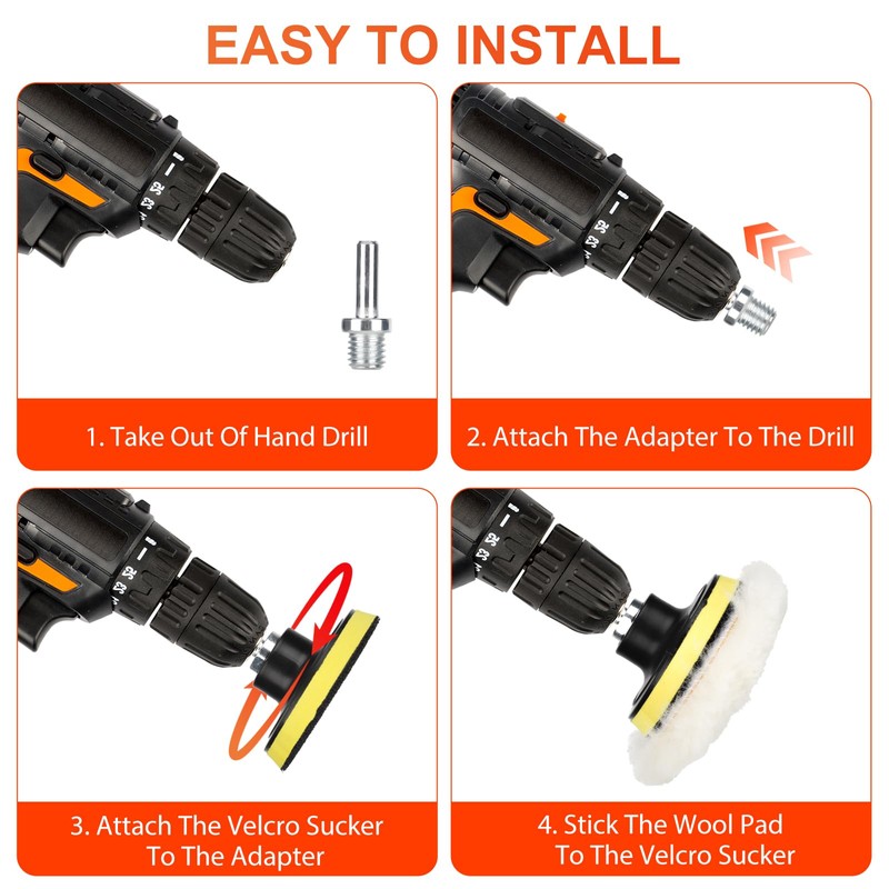 • 9PCS POLISHING SET: It includes four 3-inch soft wool polishing pads, three wool polishing pads with different levels of cleanliness, a 3-inch hook and loop back pad, and a drill adapter (M10) for easy attachment to a drill.