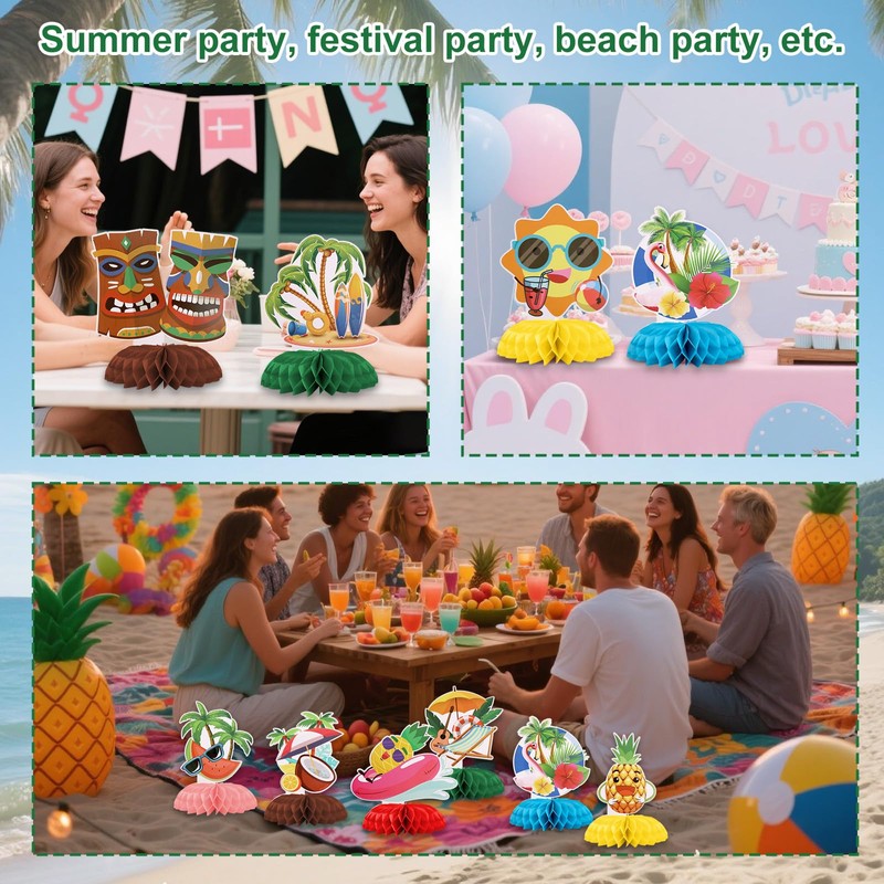 - Pretty Design: These honeycomb centerpieces feature a fun Hawaii luau theme with vibrant 3D effects, showcasing tropical elements like palm trees, sun, flowers, pineapple, and bright colors, making them a delightful addition to any celebration.