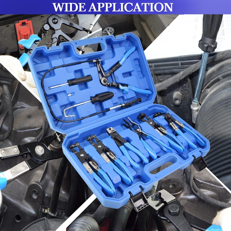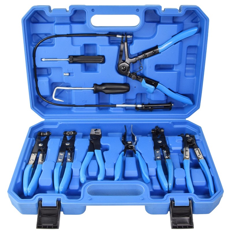 - UNIVERSAL HOSE PLIERS SET: Include long-reach cabled hose clamp pliers, swivel jaw band clip and spring wire clip pliers, regular and angled flat band hose clamp pliers, hose remover pliers, Clic-R type collar pliers, a dual-headed screwdriver, and a hose remover hook for fuel, oil, and water hose repair, removal, and replacement in car, truck, and motorcycle engines. Equipped with storage box, easy for transportation, safe storage and quick organization.