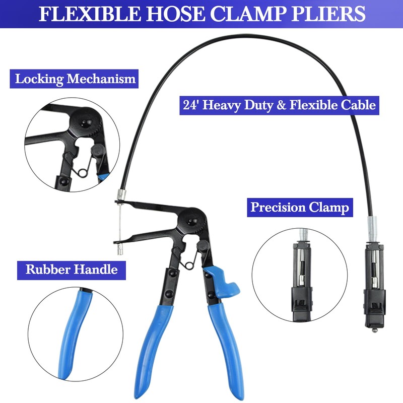 - APPLICATION: Work with hose clamps from 11/16 inch to 2-1/2 inches(18mm-54mm). Long reach hose clamp pliers with wire flexible wire shaft. For the removal and locking of clamps into open position. Convenient for working hidden areas and long distance.