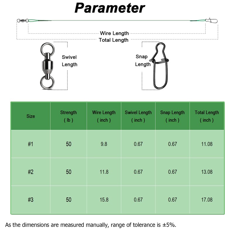 • Heavy Duty Steel Leader with Impressive Strength: There is ball bearing swivel on leaders. Designed for the demands of heavy duty fishing, our stainless steel leader wire is built to handle the strong pulling force exerted by large and powerful fish. The robust steel wire core provides exceptional strength, ensuring that your leader can withstand the toughest battles without breaking. Available in 9.8in, 11.8in, 15.8in with tensile values of up to 50lb.