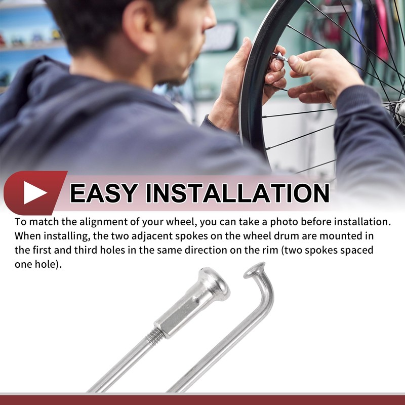 • Easy Installation: When installing, the two adjacent spokes on the wheel drum are mounted in the first and third holes in the same direction on the rim (two spokes spaced one hole). The length of bicycle spokes depends on the rim, hub, and braiding method. Please measure the old spokes and confirm the size before placing an order. To match the alignment of your wheel, you can take a photo before installation.