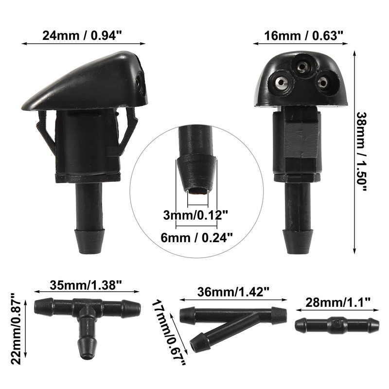 - Package includes: 2 x windscreen washer nozzles, 1 x windscreen washer hose, 12 x windscreen wiper hose connectors.