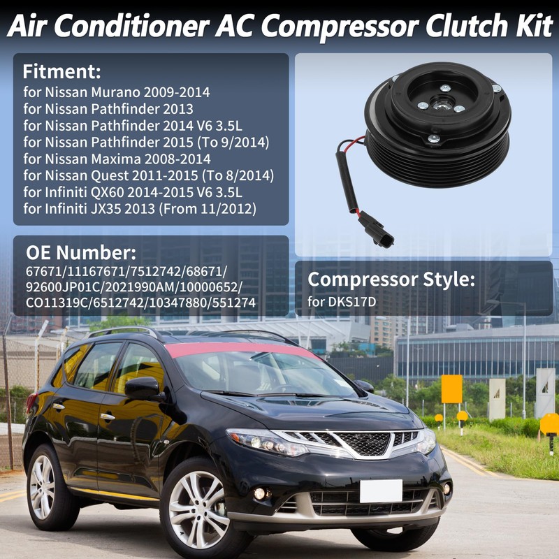 • [Fitment] This AC Compressor Clutch suit for Nissan Murano 2009-2014, for Nissan Pathfinder 2013, for Nissan Pathfinder 2014 V6 3.5L, for Nissan Pathfinder 2015 (To 9/2014), for Nissan Maxima 2008-2014, for Nissan Quest 2011-2015 (To 8/2014), for Infiniti QX60 2014-2015 V6 3.5L, for Infiniti JX35 2013 (From 11/2012), OE Number:67671/11167671/7512742/68671/92600JP01C/2021990AM/10000652/CO11319C/6512742/10347880/551274.Please confirm car make model year engine before purchase.