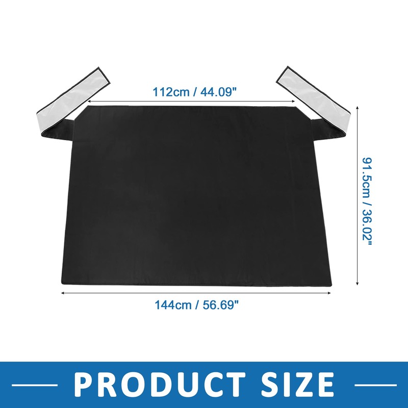 - Car windscreen cover diameter: length: 144 cm / 56.69 inches, 112 cm / 44.09 inches, width: 91.5 cm / 36.02 inches, strap length: 65 cm / 25.59 inches.