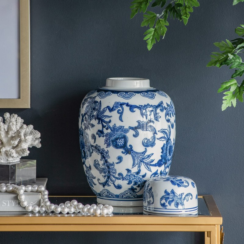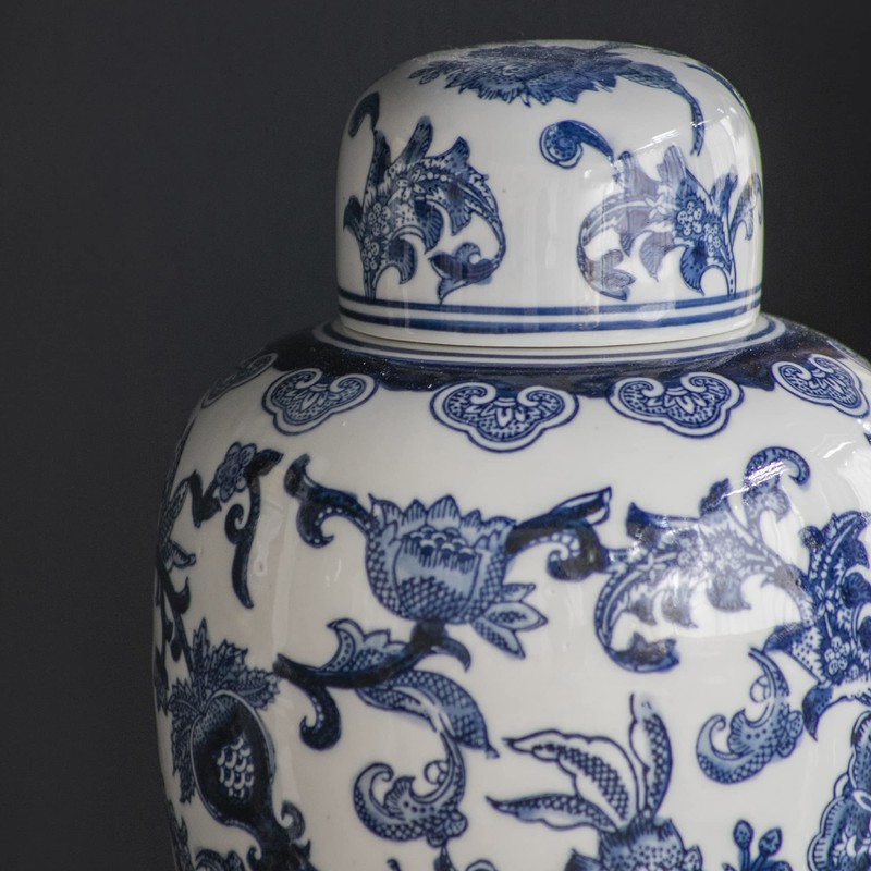 • Featuring a classically-inspired blue floral pattern which dances across the glossy white ceramic surface, this lidded ginger jar is a true gem from the Amerie Collection