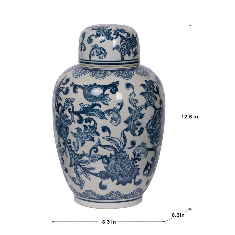A&B Home 13" Blue & White Porcelain Vase Ceramic Flower Pattern Ginger Jar with Lid Home Decor
