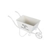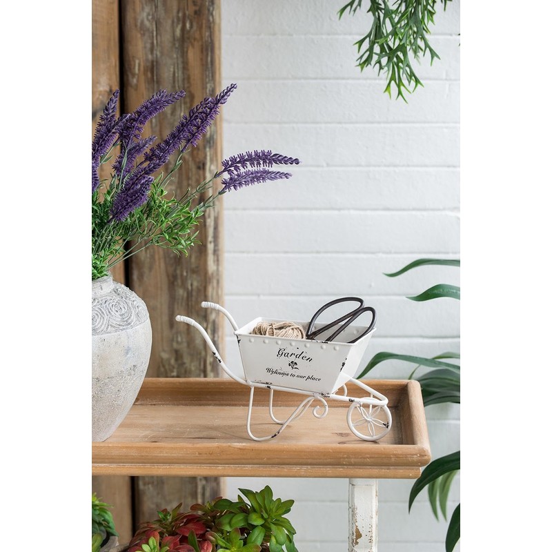 - Decorative planter durably made from iron. The white wheelbarrow is elegantly featured with subtly distressed surface, enriching the aesthetic with a touch of sophistication