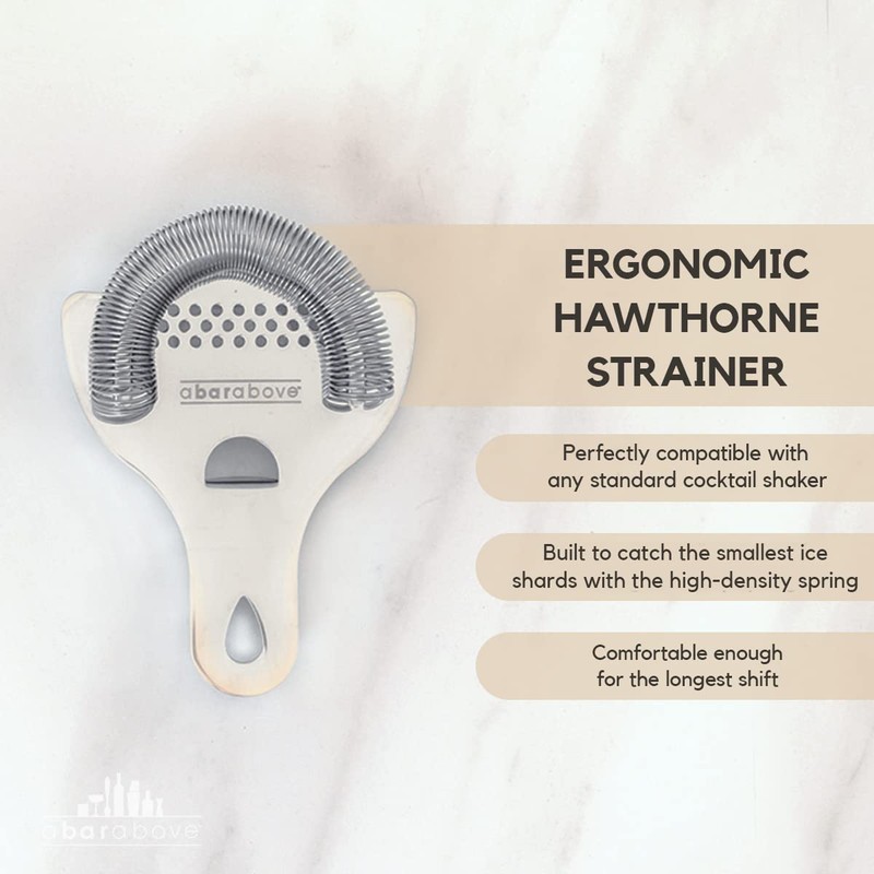 - Hawthorne Strainer: Our bar strainer Hawthorne version features a high-quality, tightly-coiled spring that acts as a barrier to keep fruit pulp and ice shards from making their way into your cocktail. This versatile bartender strainer is lightweight and has a patented cut-away design that reduces abrasion against the side of your hand.