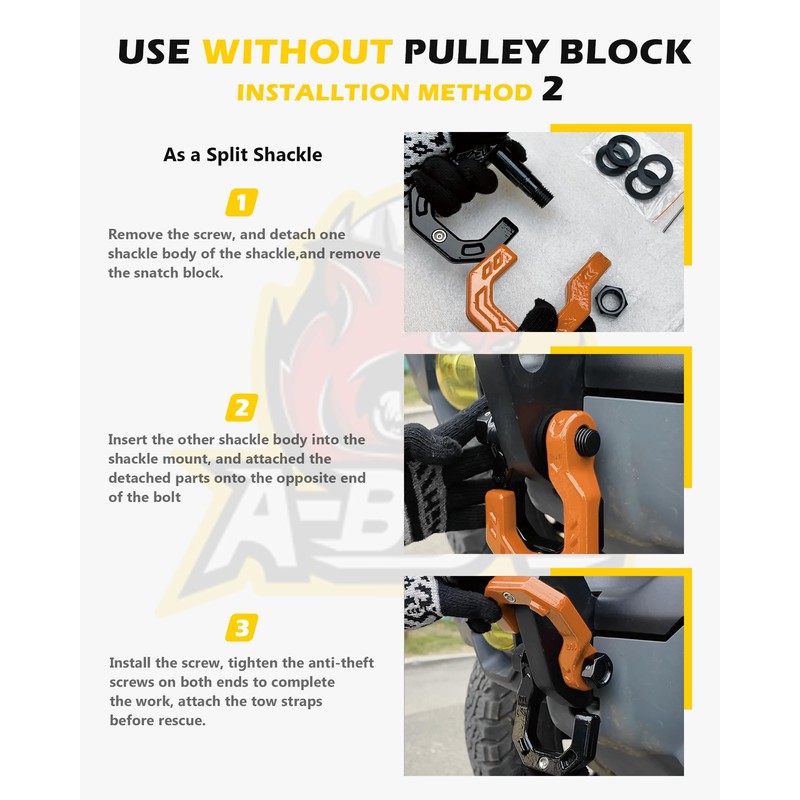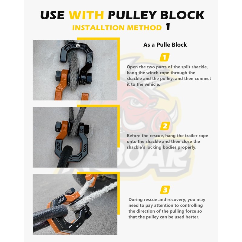 - Multi Purpose-As a Snatch Block: The pulley block save much force in the rescue or towing. The winch rope passes through the snatch block pulley, and connect the separate shackle with tow straps, tree saver straps, or recovery rope. After the connection is completed, you can start self-rescue. No complicated tool kit is required. A simple pulley and shackle set can meet these needs
