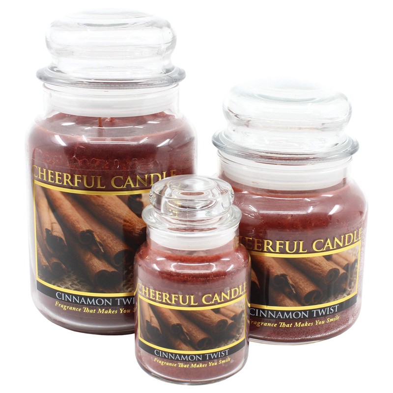 A Cheerful Giver Cinnamon Twist 16 oz. Jar Candle. Each candle has been tested to ensure outstanding fragrance throw, unsurpassed burn and a fantastic label design. Double wicked jar. Fragrance consists of a warm, rich and brown spicy aroma of fresh grated cinnamon sticks. Holds 16 ounces. Burn time is 80 hours.