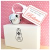 - 50mm metal bell, white high quality double sided satin ribbon, 300GSM printed card tag, high quality white gift box with handstamped design on front (design varies).