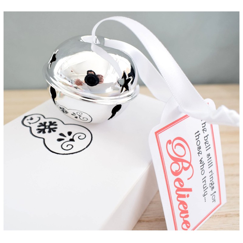 Features: -50mm mirrored silver bell - High quality "the bell still rings for those who truly believe" card - white satin hanging ribbon - comes boxed in a hand stamped design white box so can be kept safe after christmas and is perfect for gifting. One of two bauble designs will be sent at random. The box measures 12 x 7.5 x 4.5 cm so there is room for you to add in your own small item too or reuse the box for gifting.