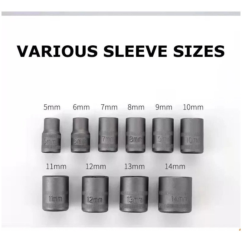 - 10 Pcs hex Drive Socket Set- 1/4-inch drive socket set includes 9 sizes for use-5mm 6mm 7mm 8mm 9mm 10mm 11mm 12mm 13mm and 14mm. This 1/4” hex impact socket adapter set is made of heavy-duty chrome-vanadium steel, sturdy, wear-resistant, long service life ensured. Hex drive sockets fit widely-used hex-shaped fastener heads; With standard-length, the metric socket set is relatively versatile and suitable for a wide range of applications.