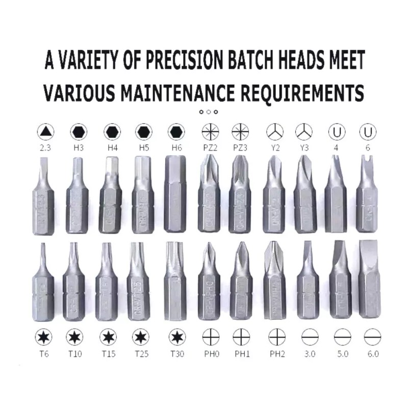 - 22 Pcs Screwdrivers Bit Set- Phillips bit (PH0, PH1, PH2). Torx bit (T6, T10, T15, T30), Hex bit (H4, H5,H6), (Pz2,Pz3), (Y2,Y3,),(U4,U6), (2.3),(3.0,5.0,6.0), Core removal and Schrader valve insertion bit.