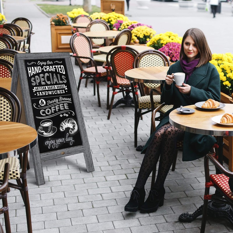 - Magnetic surface: In addition to offering the texture of a traditional wood street sign, our A frame chalkboard features magnetic porcelain steel so you can decorate it with letters, messages, photocards, jokes, etc. Compatible with liquid chalk markers as well as regular chalks.