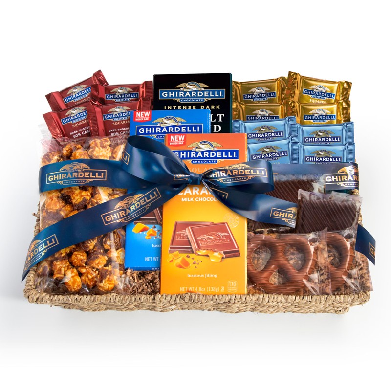 - This basket is filled with Ghirardelli classics and new favorites including three full-size chocolate bars and a dozen assorted chocolate Squares.
