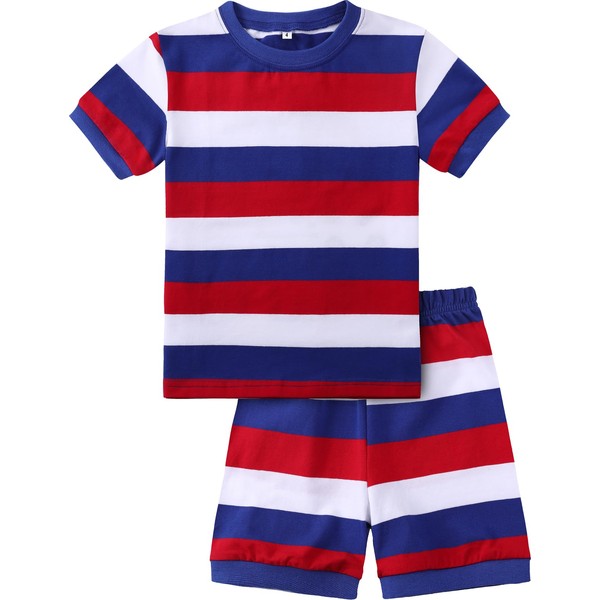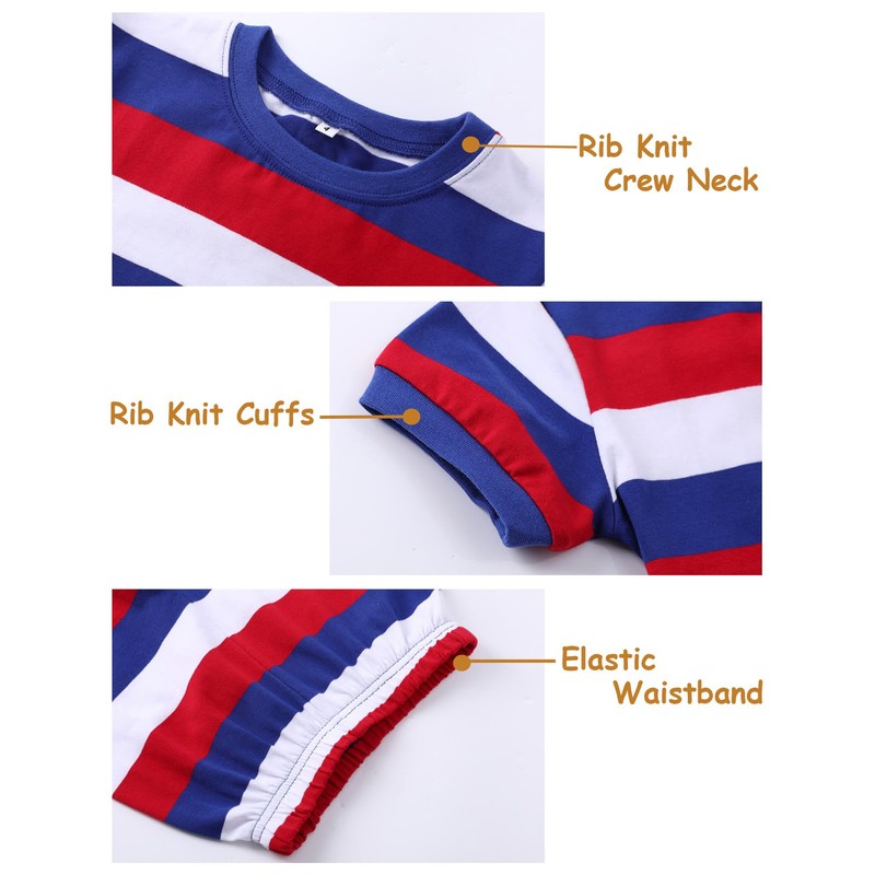 - [Pajamas Set] A&J DESIGN 4th of July pajamas for kids in the kids striped pajamas series comes with 1 short sleeved red white and blue striped shirt pajama and 1 red white and blue striped shorts.