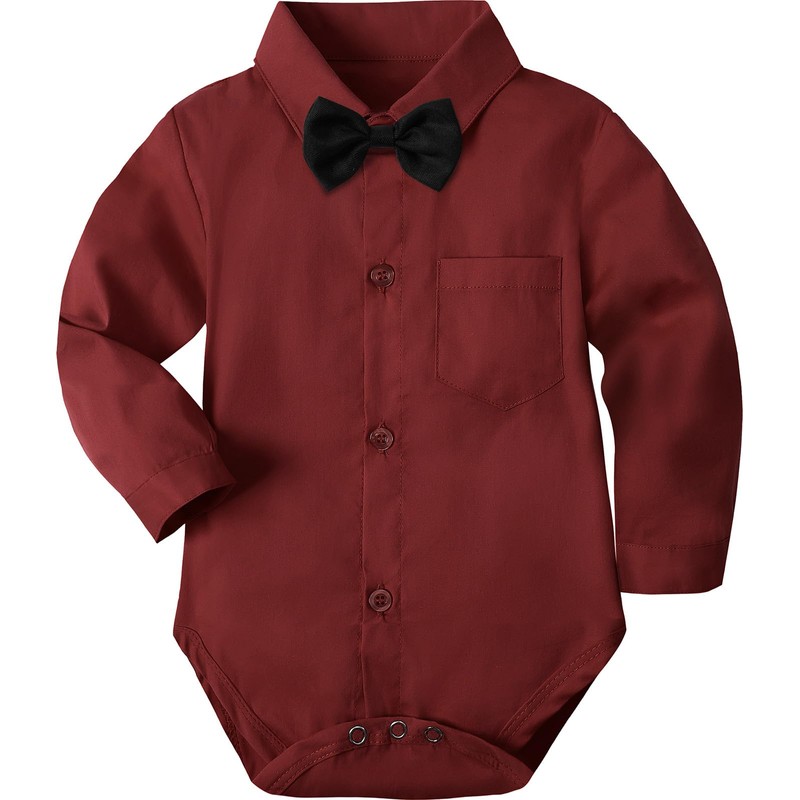 A&J DESIGN Shirt for Baby Boy Clothes Rompers Long and Short Sleeves with Bow Tie Party Gift 3-18 Months, Wine, 12-18 Meses