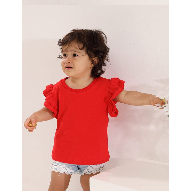 A&J DESIGN Toddler Tshirts Girls Cotton Tops Ruffle Plain Tee (Red, 4T)