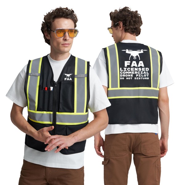A-KSAFETY High Visibility Security Vest for Security Guards, Safety Workers, Construction & Men's Work, Black-drone Pilot, Medium