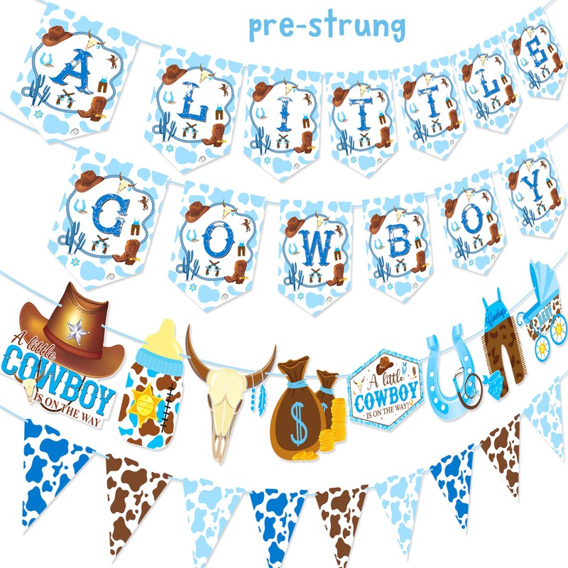 - ❤【A little cowboy baby shower banners】The 4Pcs cowboy birthday party banners were specially designed for baby boys. The banner with the words "a little cowboy" was printed on the cardboard, with a western cowboy cutout banner and a cowboy-themed pennant. Surprise your party with unusual combinations.