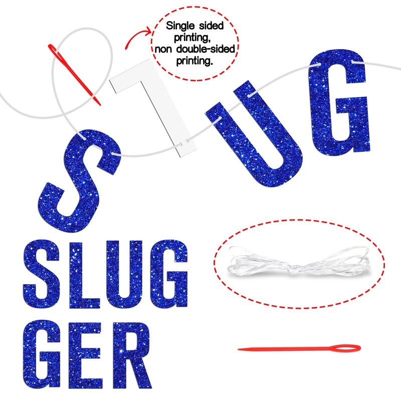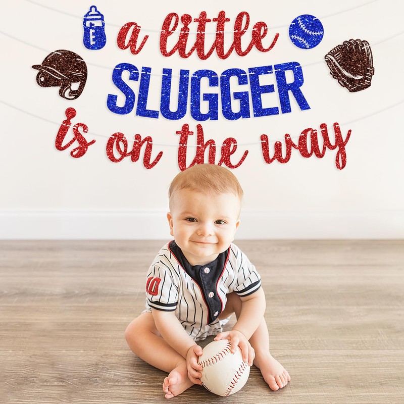A Little Slugger is on the Way Banner, American Baseball 1st Birthday for Boy, Sport Themed Rookie Birthday/Gender Reveal/Baby Shower Party Decoration Supplies, Blue and Red Glitter