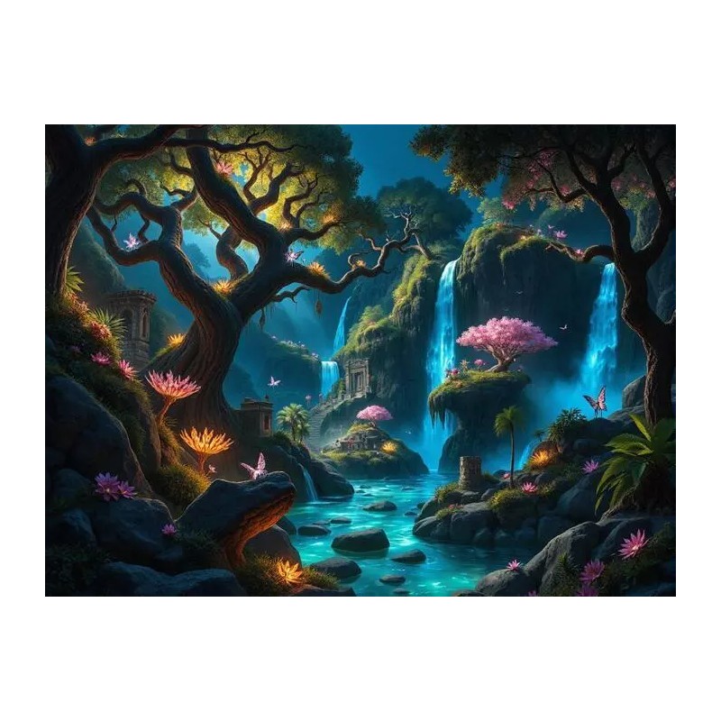 A Mystical Forest with Waterfalls, Ruins, and Glowing Flora Poster 18 x 24