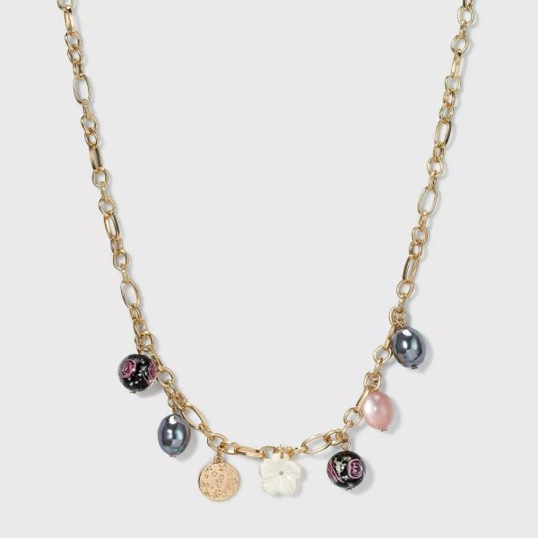 Description:   Add sparkle and shine to your everyday looks with this Simulated Pearl and Floral Charm Frontal Necklace from A New Day™. Set on a simple link chain in a gold-tone finish, this charm necklace features simulated pearl and floral accents for a delicate, standout look. This necklace fastens with a lobster-claw clasp for secure wear, and extra chain makes the length fully adjustable to find your perfect fit. Color: Black. Gender: female. Age Group: adult.