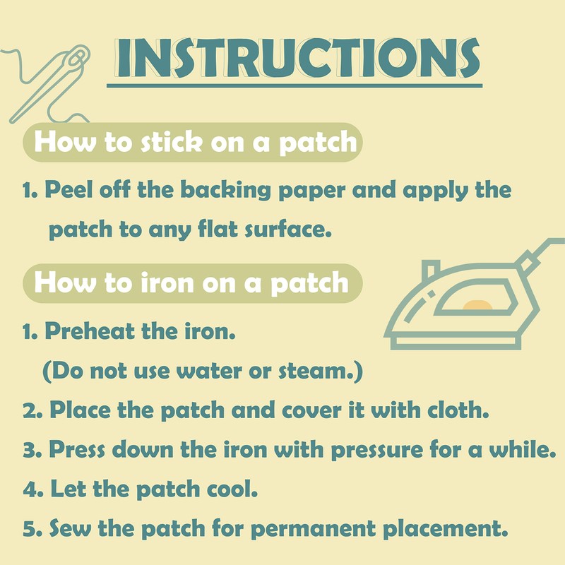3. The patch can also adhere temporarily to the fabrics without using a clothes iron for the first time. To increase the adhesion, using the clothes iron to iron the patch on and then use a needle thread to sew the patch on the clothing.