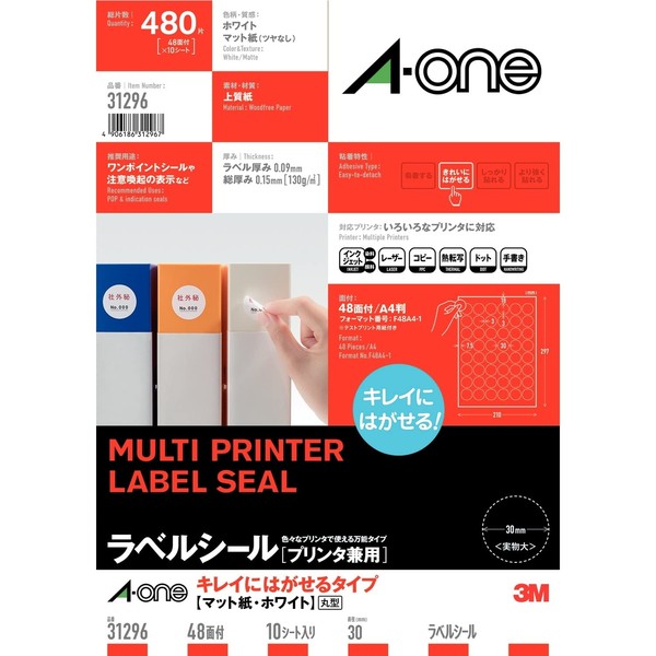 A-One 31296 Label Seal, Clean Removable, A4, 48 Stickers x 10 Sheets, Round