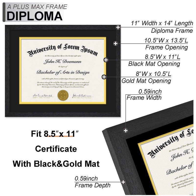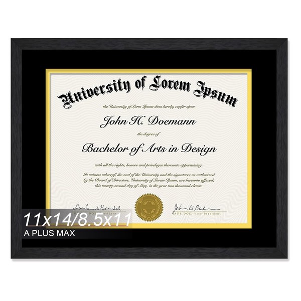 A PLUS MAX 11x14 Diploma Frame Display 8.5 x 11 Certificate with Black & Gold Mat, Engineered Wood Document Frame with Black Wood Grain for Masters Associates Bachelor Degree - 1 Pack