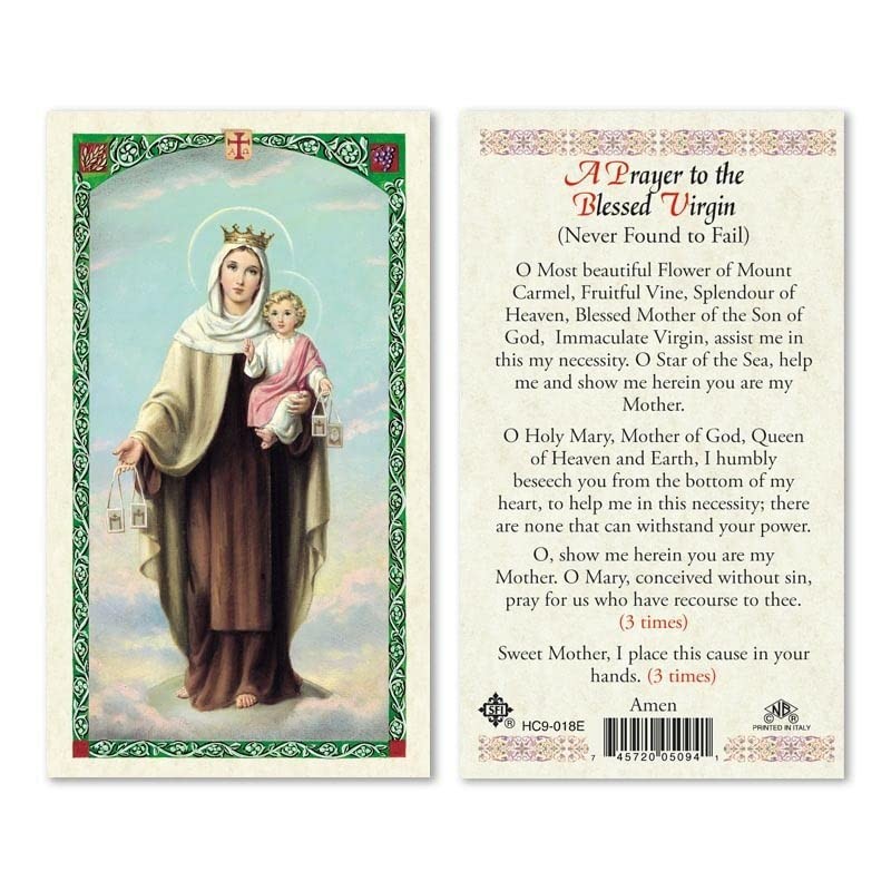 A Prayer to the Blessed Virgin Of Mount Carmel.Laminated 2-Sided Holy Card (3 Cards per Order)