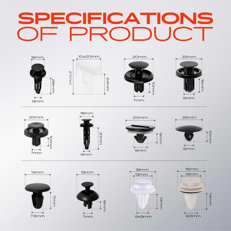 - [Package Include]: 10x Grille Clips; 15x Hood Clips; 20x Door Trim Clips; 25x Fender Clips; 30x Bumper Clips