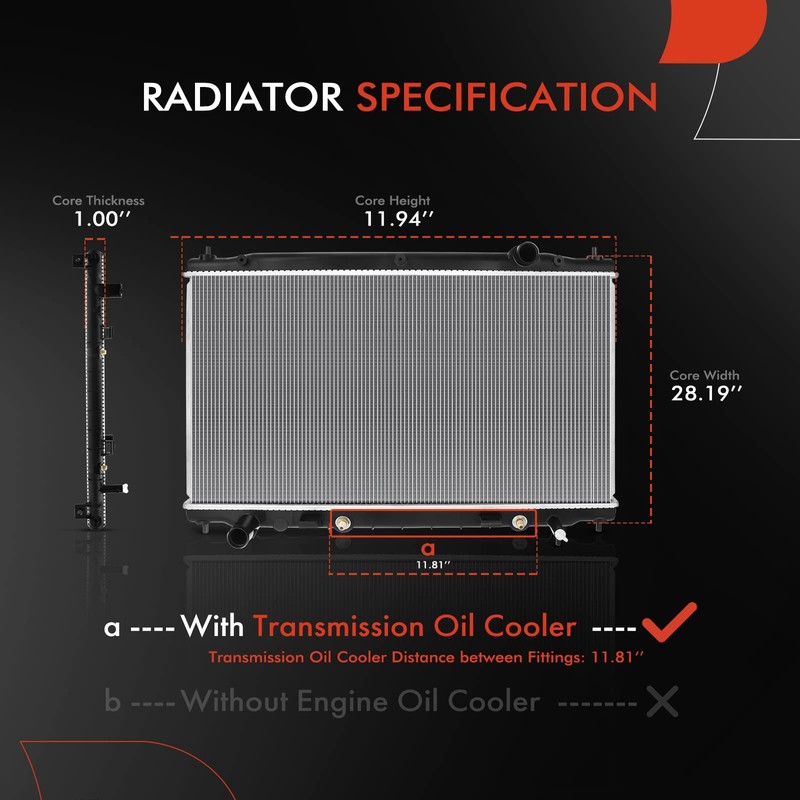 - [Specifications]: ① Transmission Oil Cooler Included: Yes; ② Engine Oil Cooler Included: No; ③ Core Height: 14-15/16 inch; ④ Core Thickness: 1 inch; ⑤ Core Width: 28-3/16 inch; ⑥ Inlet Diameter: 1-3/8 inch; ⑦ Outlet Diameter: 1-3/8 inch
