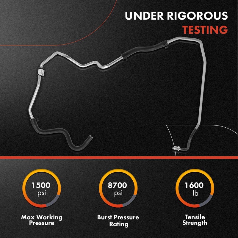 - [The Performance]: Hose Type: Power Steering Hose Assembly; Working Pressure: Up to 1500 psi; Burst Pressure: Up to 8700 psi; Tensile Strength: Up to 1600 lb; Working Temperature: -40℃ to 154℃