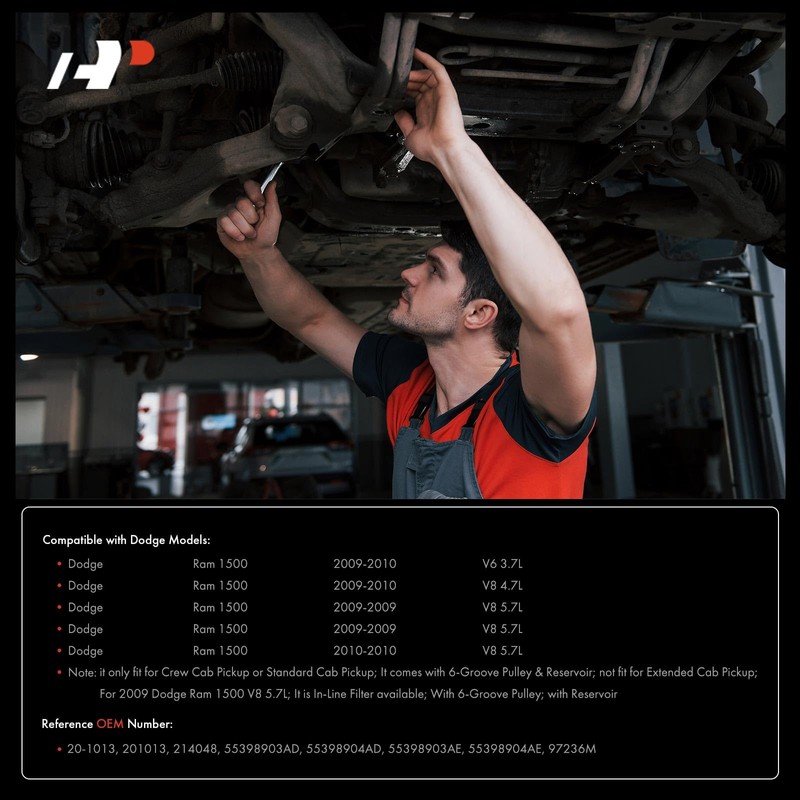 Note: It is In-Line Filter available; with Reservoir; With 6-Groove Pulley; It comes with 6-Groove Pulley & Reservoir; For 2009 Dodge Ram 1500 V8 5.7L, it only fit for Crew Cab Pickup or Standard Cab Pickup, not fit for Extended Cab Pickup