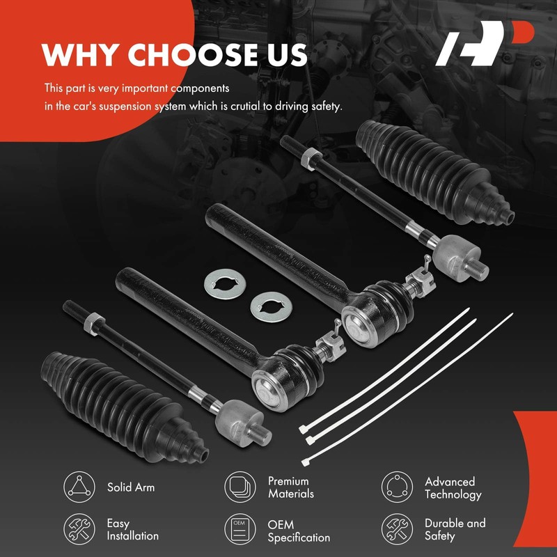 - [Package Detail]: 2 x Front Inner Tie Rod End, 2 x Front Outer Tie Rod End, 2 x Front Rack And Pinion Boot