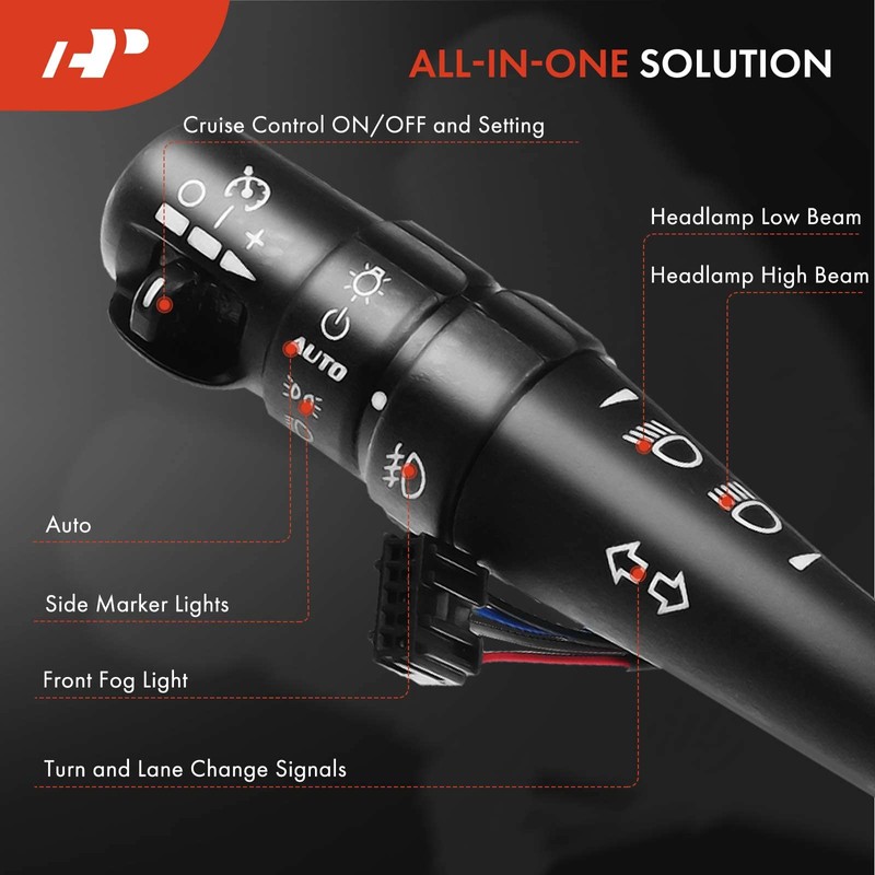 - [Switch Function]: To "Turn and Lane-Change Signals" ✔ "Headlamp High/Low-Beam Changer" ✔ "Parking Lamp" ✔ "Fog Lamps" ✔ "Exterior Lamps" ✔ "Cruise Control" ✔ "Windshield Wiper" ✔ "Windshield Washer" ✔ "Hazard Warning Flashers" etc