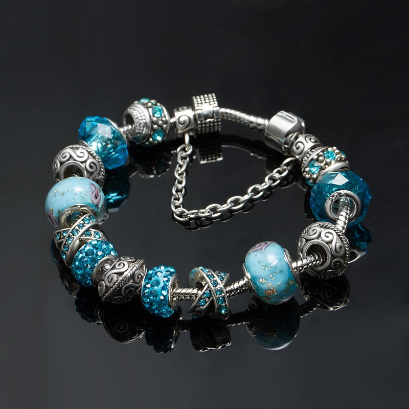 A TE Charm Bracelet Blue Crystal Murano Glass Beads Women JWB94