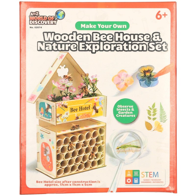 A to Z World of Discovery DIY Wooden Bee House and Nature Exploration Set, STEM Educational Toy, Ages 6+